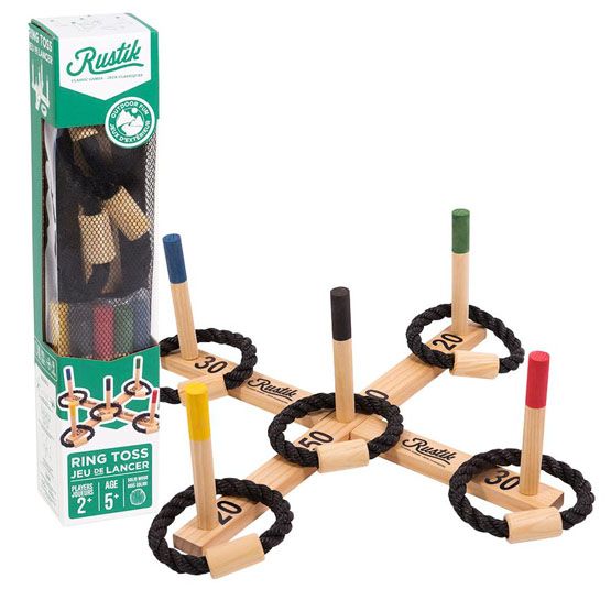 Jeu d’anneaux à lancer en bois pour 2 joueurs ou plus. Le jeu de lancer d’anneaux de Rustik est une version facile à transporter du classique jeu de lancer d’anneaux. En effet, les anneaux faits en corde ainsi que la base de jeu, qui se monte et se démonte rapidement,29,95$ -