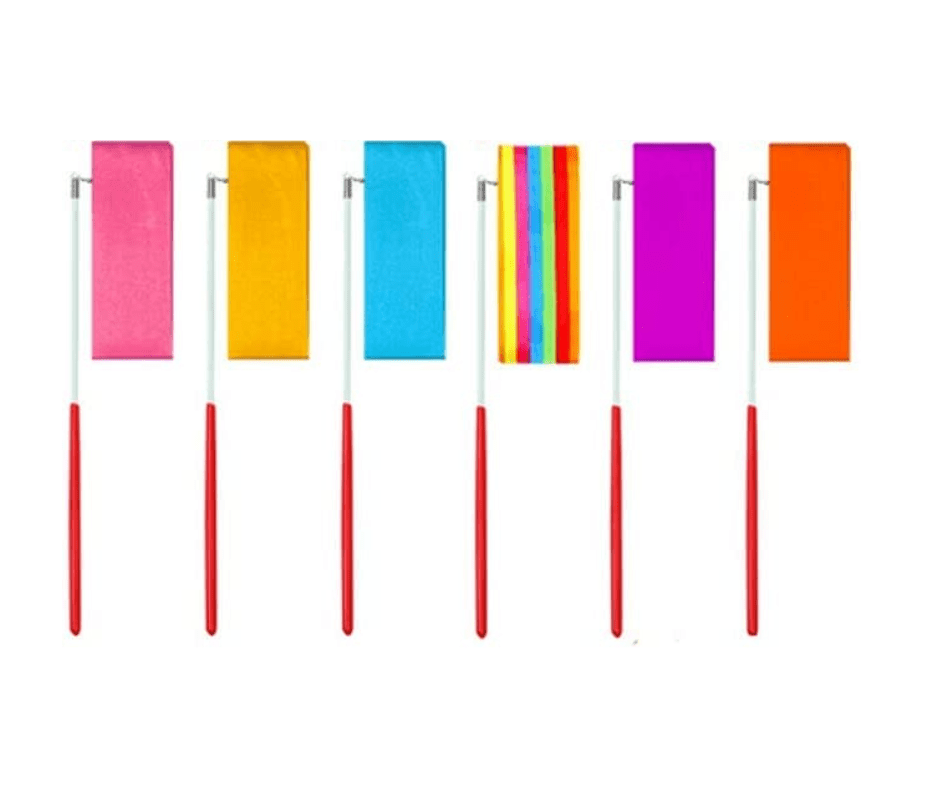 6 superbes rubans de satin de 2m pour vos activités de mouvement. Chaque ruban est fixé à un bâton de plastique de couleur coordonnée. Il est si agréable de faire bouger les rubans au son de la musique tout en pratiquant la coordination main-yeux et l’équilibre. Très facile à manipuler -
