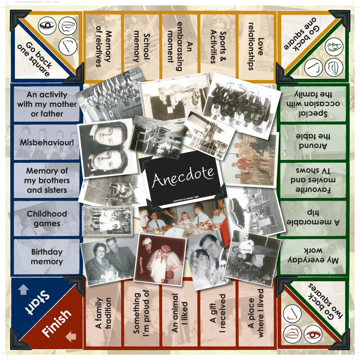 Anecdote is a game that will always feel new because each participant has numerous memories associated with each theme developed on each square. The 24” X 24” colour laminated game board includes 20 squares divided in 4 life periods : childhood, adolescence, adult life and life in general.