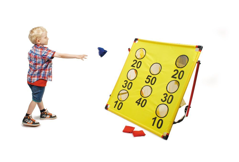 Placez les deux plateformes face à face, à la distance désirée selon les capacités du groupe. Lancez les sacs à tour de rôle et marquez 3 points lorsqu’il atterrit dans le trou et 1 point sur la surface. D’ailleurs, n’hésitez pas à adapter les règles pour favoriser la réussite (distance réduite, points bonifiés, jeu collaboratif). Conservez le jeu dans un endroit sec pour préserver la qualité du bois.